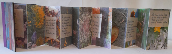 My latest bookwork Autumn this month of October is a concertina bookwork incorporating images from my local area and poems and quotes. See more images of this book in the link above.