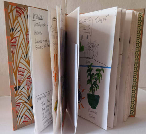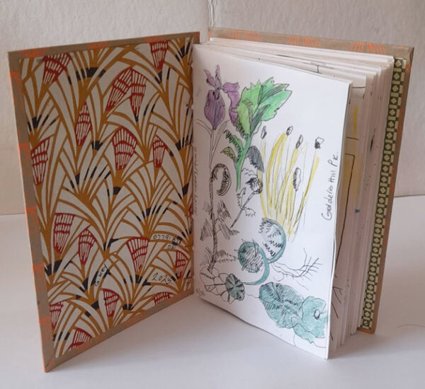 Coptic Binding: A daily journal and sketchbook ( June 2025): a sewn bookwork with the thread on the outside of the book. Incorporating sketches and notes from visits around London in 2025. The cover and end page are decorative papers from Falkiners Paper Shop in London.