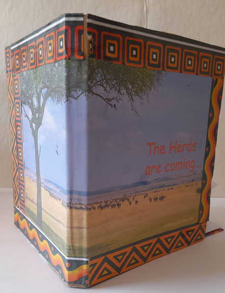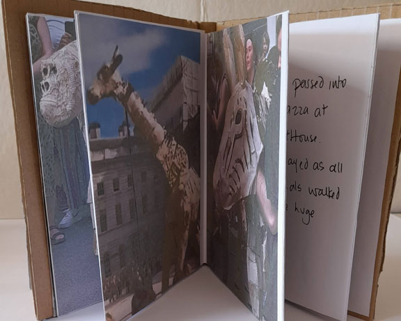 Concertina bookwork with corrugated card cover: The Herds are Coming to London, (May 2025). I made this book after seeing the Herds that came to Somerset House in London: Hand constructed large, life size animals: giraffes, lions, baboons, etc. A wonderful event that travelled from Africa to the Arctic and many countries on the way.