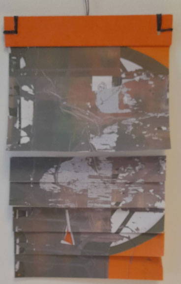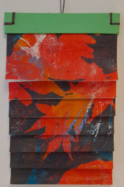 Two small Scroll books: (August 2025): the flowery cover is a gelli print on thin Japanese paper and the second is a digital print of graffiti on a postbox in Holloway Road, London. I need to research the Chinese Scroll and work with some kind of closure – more work to do.