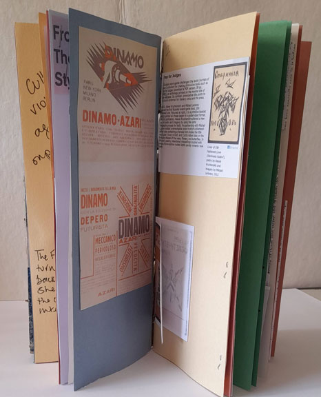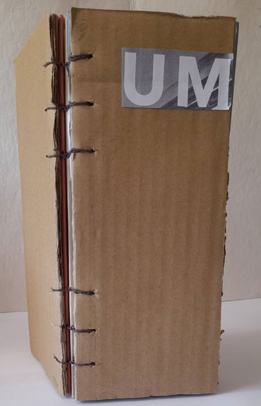Um: (Spring 2025) bookwork made after my visit to the Futurism Exhibition at the Estorick Collection in Islington. The cover is corrugated cardboard, the sewing is coptic, not easy as the card tends to pull apart. Inside are images and text from the exhibition.
