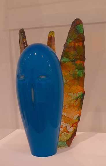 The exhibition includes rugs, furniture, ceramic figures, paintings.