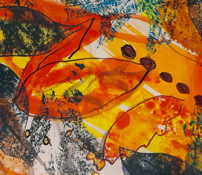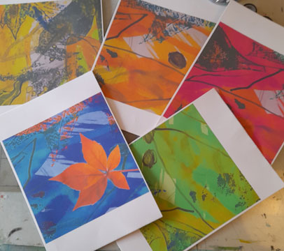 Monoprint of autumn flora. I started with a large A2 sheet of paper and made monoprints using leaves, bark, berries, etc. in acrylic and printing ink. Then I scanned in sections of the monoprint for my bookwork, so that each section was a different colour