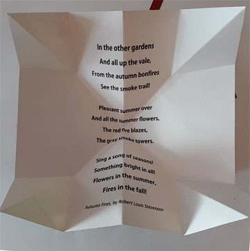 The Darkening Sky: folded bookwork: 10 x 10 cm. Printed on heavy cartridge paper on my Epson Printer. This is a folded bookwork, each section has an Autumn related poem on the inside. The title is a line from one of my own poems included in the bookwork : The leaves darken and tremble, fluttering to the dusty ground, as I continue my walk under the darkening sky..